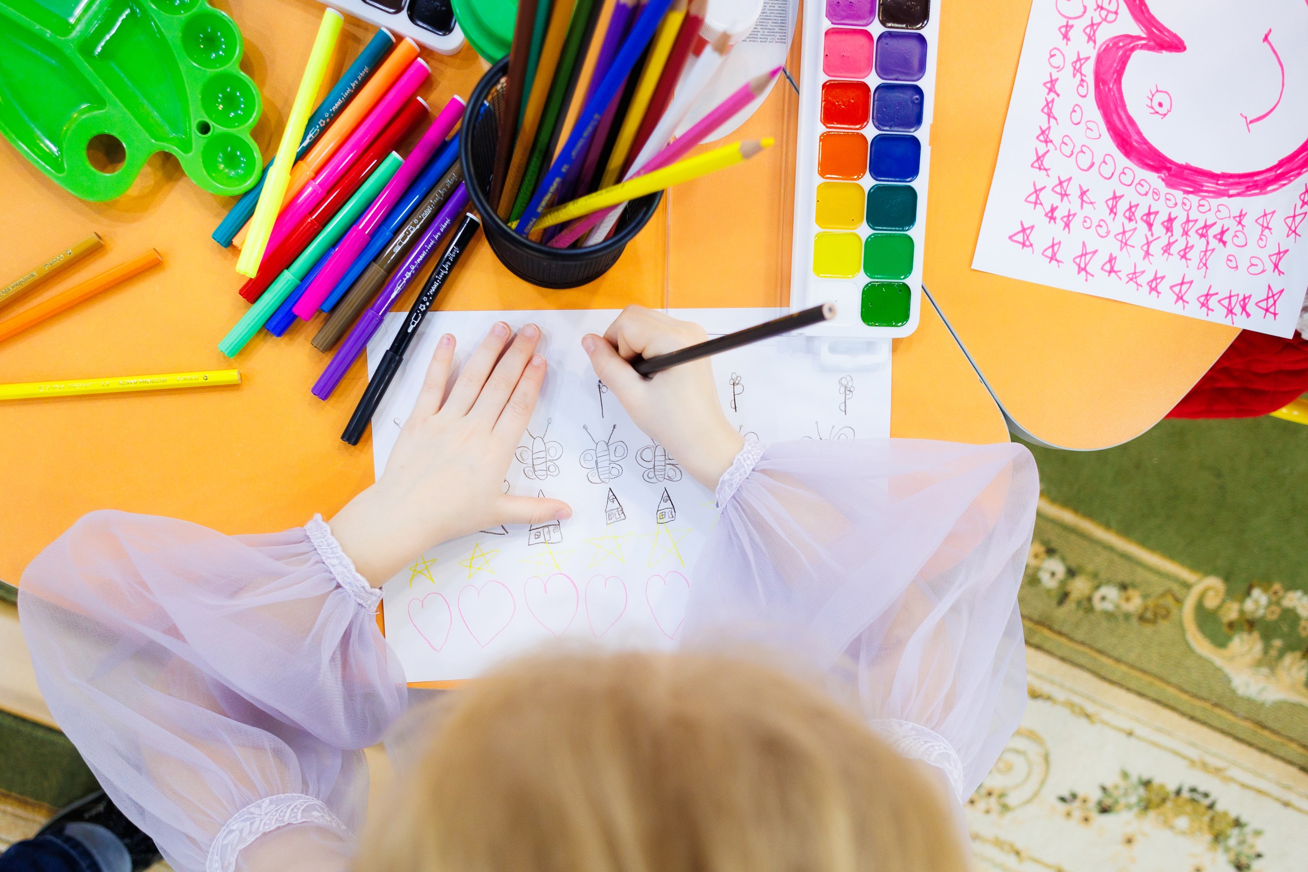 A child painted by artist Dmitri Potapov in the mural, framed by colourful figures drawn by students to express their new-found sense of comfort.
