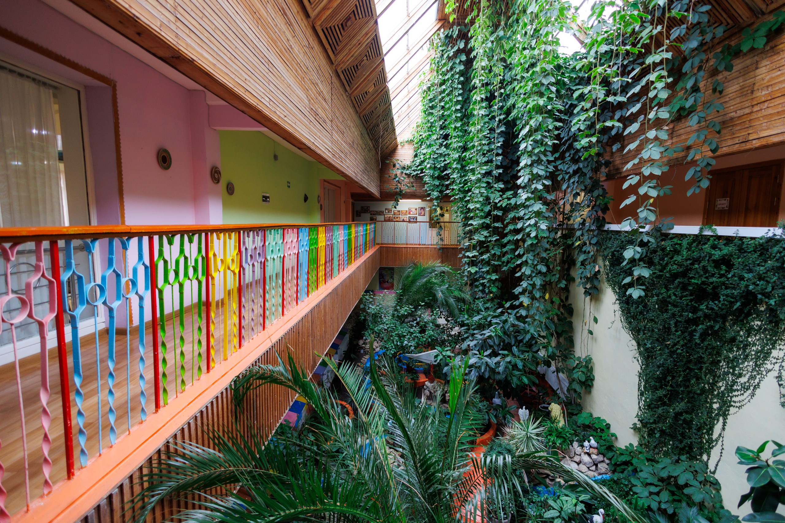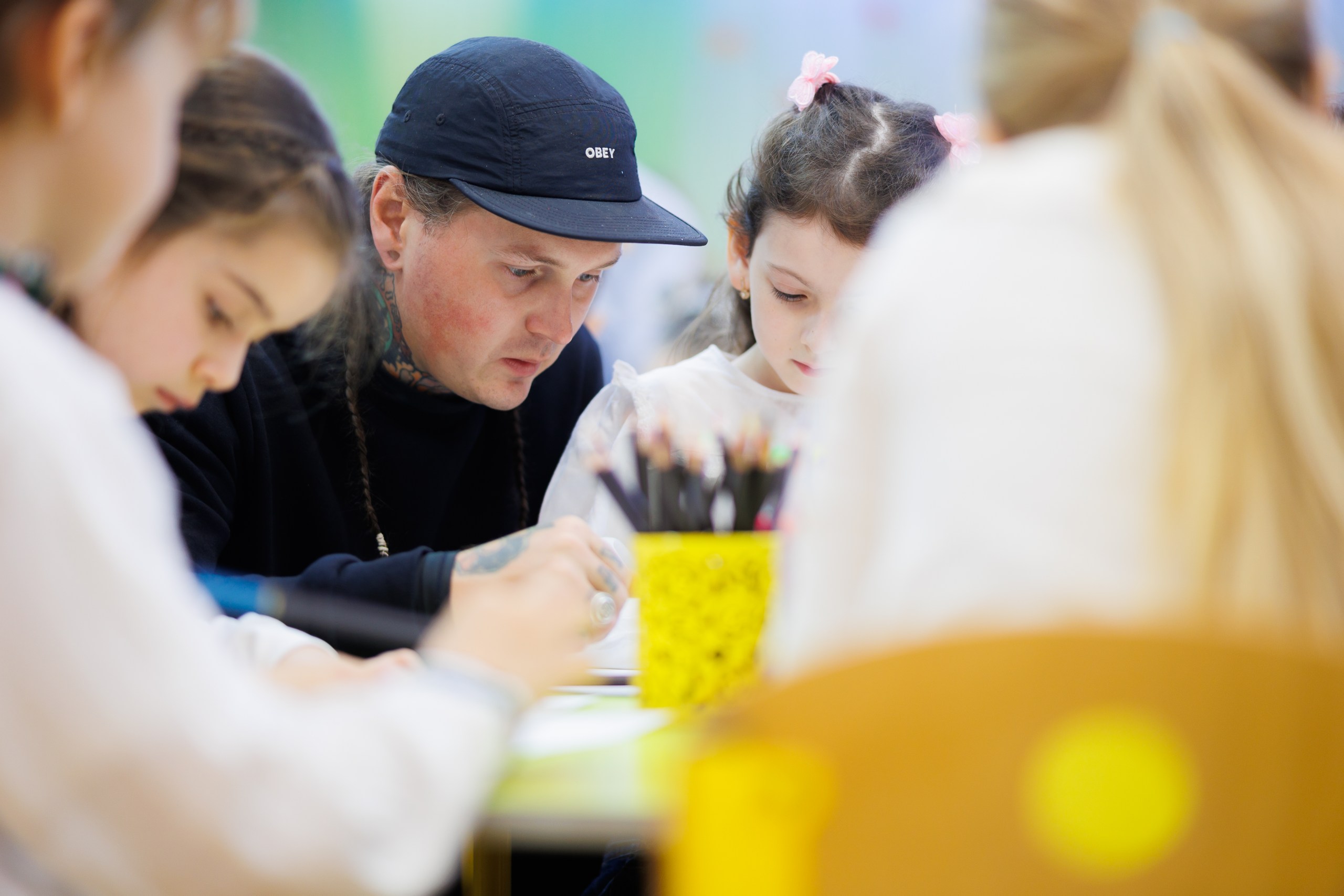 The mural was shaped with the participation of the children themselves. Potapov led workshops where students explored colour, played with shapes and imagined what their warm, joyful school looked like. Their drawings featured suns, trees, windows and smiling faces, many of which became part of the final piece.
