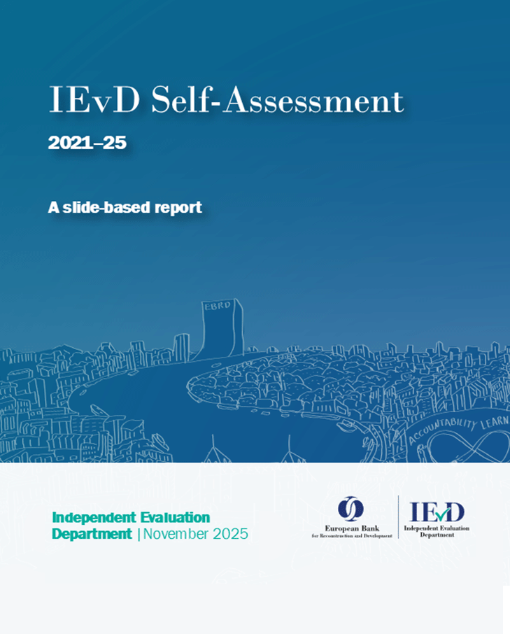 The IEvD Self-assessment 2021–2025 is a slide-based report reflecting the Independent Evaluation Department's progress against the Strategic Plan objectives, highlighting achievements and areas for improvement. This self-assessment will inform the next external review of the EBRD evaluation function, as required by the revised Evaluation Policy and following the precedent set by the 2019 "Kirk Report."
