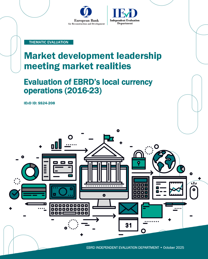 This evaluation assessed EBRD's three-pillar approach to local currency operations over the period 2016-2023, covering 19 countries that participated in or were eligible for the SME Local Currency Programme. The evaluation examined whether the intended synergies between policy dialogue, funding operations and lending activities have materialised to deliver transition outcomes. Using a theory-based mixed-methods approach with three in-depth case studies and sixteen country reviews, the evaluation tested whether policy results enabled onshore funding and liquidity management at lower costs to enable more flexible EBRD lending offer in local currencies.