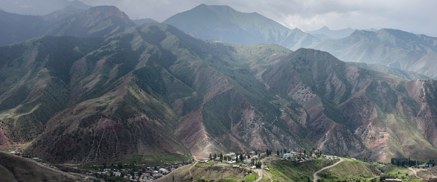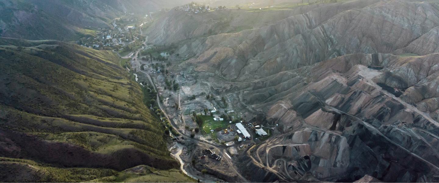 A view of the valley. The former uranium production facilities, and the big chimney at the heart of it, are visible in the centre of the shot. The site has now been returned to nature, opening a new era for Kyrgyzstan, for Min Kush, its people, those who may return, and for the next generation.