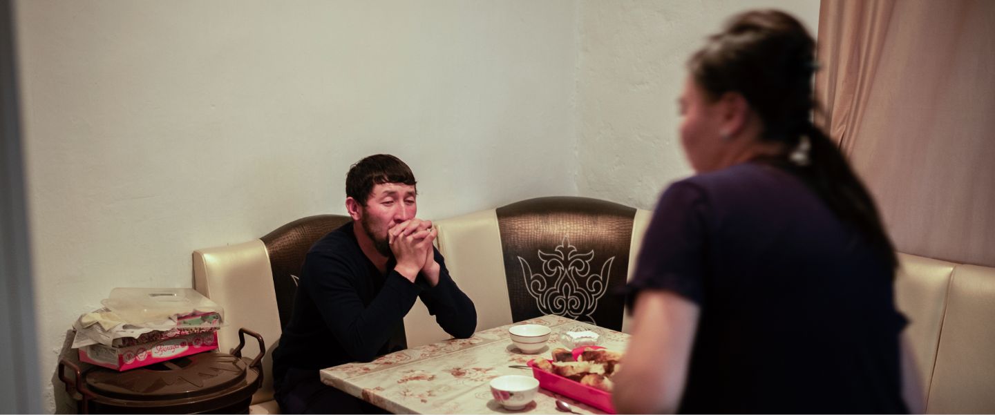 Uzak at home with his wife Baktygul, 25 years old, who is a teacher at the local school. They own three flats in their building, which is partially deserted. They live in one of the flats.
