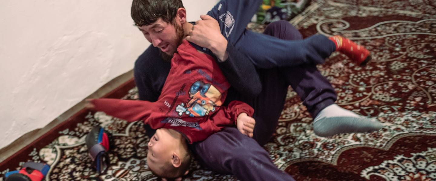 Uzak plays with his son Nuriman, 5 years old. The family’s dream once the remediation is complete is to open a guesthouse in their two spare flats for tourists. Like many of those who still live in Min Kush, Uzak believes tourism holds the key to the town’s future.