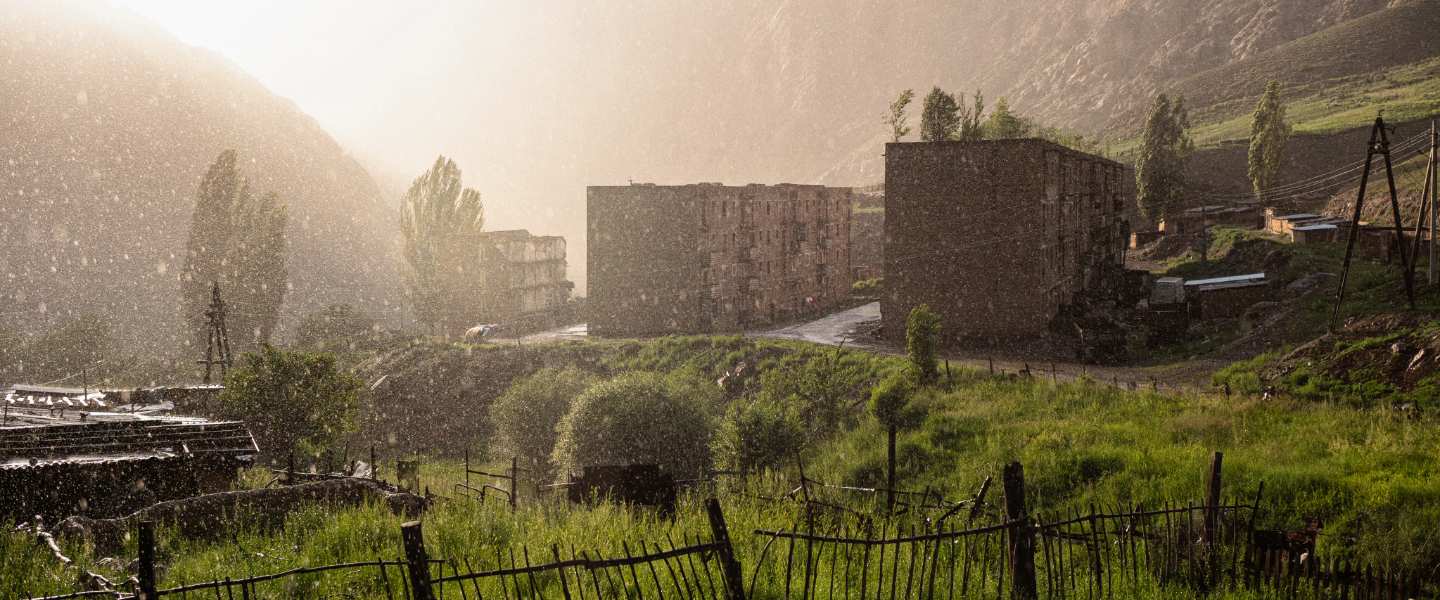 Sunlight through summer rainfall in Min Kush. The collapse of the Soviet Union, and the abandonment of the uranium plant, has seen population numbers in Min Kush plummet as people of working age leave for the capital Bishkek or for Russia. Once numbering as many as 20,000, the town has fewer than 3000 inhabitants today.