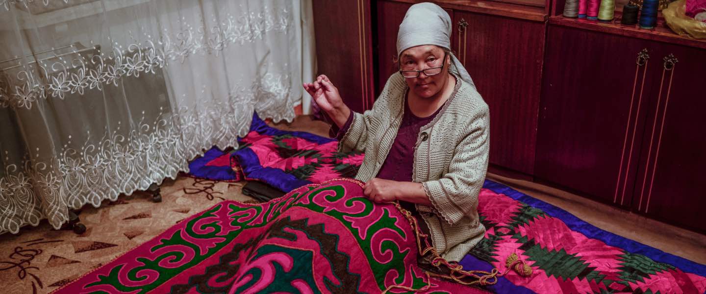 At home, Bubuaim has a sewing workshop and produces traditional Kyrgyz carpets as well as tailor made traditional clothes. This used to be her main source of income, providing enough money to live comfortably. But as people have left Min-Kush, she has lost many of her customers, and now has to work at the coal mine to sustain herself.