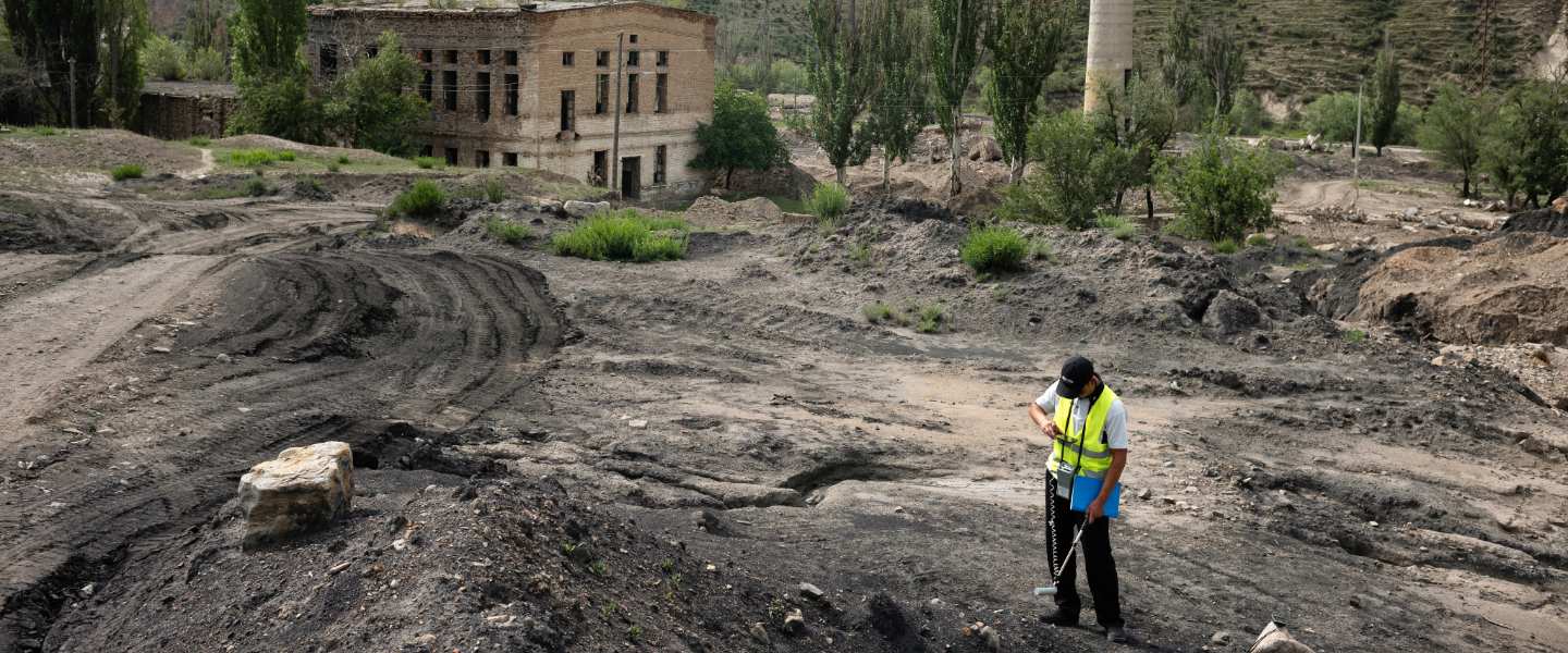 A member of the Kyrgyz Academy of Sciences monitors radiation levels at the former uranium processing site in Min Kush. Careful monitoring ensures that demolition and remediation works are carried out safely.
