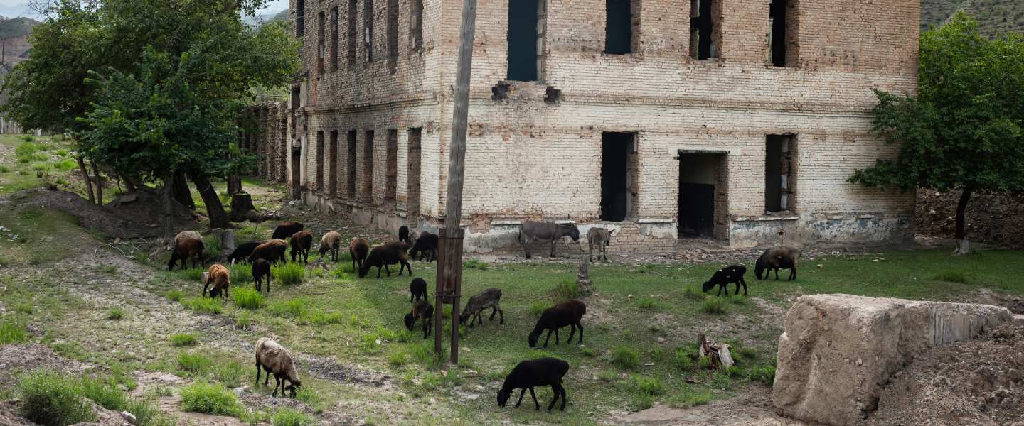 A flock of sheep grazes on contaminated grass beside an abandoned administrative building and laboratory at the site of the uranium processing plant. One of the purposes of the remediation programme is to ensure that radioactive substances do not enter the water supply and food chain.