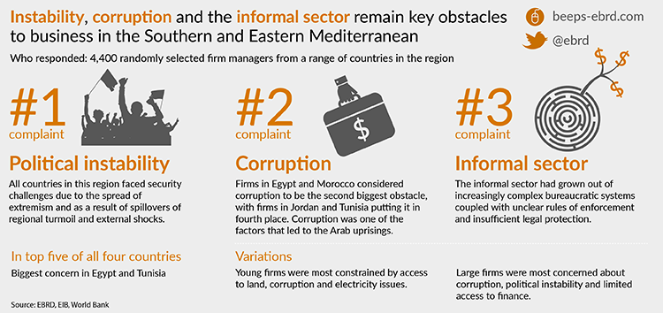 These new surveys conducted by the EBRD, the World Bank Group and the European Investment Bank in SEMED as well as in Djibouti, Israel, Lebanon, West Bank and Gaza and Yemen, are based on interviews with more than 6,500 randomly selected firm managers from a range of countries in the region.