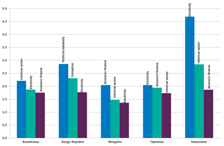 Electricity issues were the main obstacle in Albania, Tajikistan and Uzbekistan, and they were among the top three in a further 12 transition countries. The underlying reasons differed across countries. In Central Asia, it was mostly to do with unreliable electricity supply, which was characterised by frequent and costly power outages. In central Europe and the Baltic states (CEB), on the other hand, it stemmed from high electricity prices.