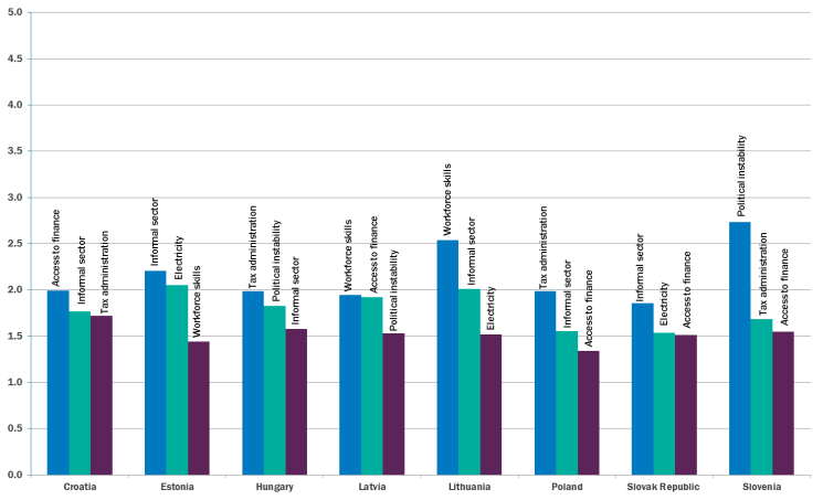 In the CEB region, where corruption tends to be less prevalent, onerous tax systems were a major obstacle for young firms. This often related to the time that it took to fulfil tax obligations.