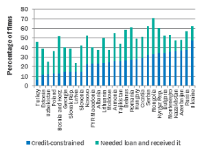 The percentage of firms that had applied for a loan also decreased substantially, declining by almost a third compared with BEEPS IV (falling from 38.1 per cent to 24.7 per cent). This suggests that part of the deleveraging process across the transition region is demand-driven. In the aftermath of the crisis, many firms have revised their investment plans downwards or abandoned them altogether, so they no longer have any need for a bank loan. A clear and unambiguous measure of whether firms are credit-constrained can be created by combining firms’ answers to various BEEPS questions. Credit-constrained firms are defined here as those that need credit but have either decided not to apply for a loan or were rejected when they applied.