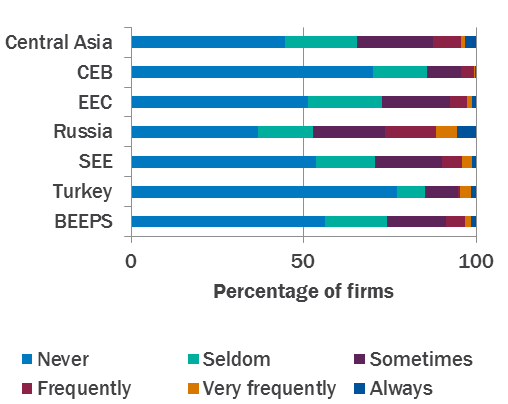 The size of informal payments made to public officials to “get things done” decreased in all regions and in all countries. However, this type of corruption remained widespread in Russia and Central Asia, where less than 45 per cent of enterprises reported that they never made such payments (see Chart 18). Furthermore, in several countries the percentage of firms that made such payments at least occasionally increased relative to BEEPS IV – by more than 10 percentage points in Russia, Armenia and Lithuania.