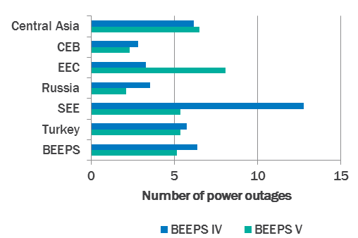 Issues related to electricity remained the third largest obstacle to firms in BEEPS V. However, looking at the transition region as a whole, some improvements have been made since BEEPS IV. The average time that it takes to be connected to electricity fell from 49.5 days in BEEPS IV to 36.3 days in BEEPS V, while 38.4 per cent of firms reported experiencing power outages in BEEPS V, compared with 43.7 per cent in BEEPS IV. In addition, the average number of power outages decreased from 6.4 to 5.2 per month, and they lasted almost an hour less on average (3.7 hours, compared with 4.6 hours in the previous round). That being said, the percentage of firms reporting that informal gifts and payments had been expected or requested in return for being connected increased from 10.7 per cent in BEEPS IV to 12.1 per cent in BEEPS V.