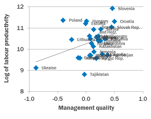 There are other ways of improving firms’ productivity, besides improving the external business environment. Firms’ managers can make better use of excess capacity (if they have any), they can cut costs (shedding labour where necessary), and they can improve the way they manage their businesses. That is to say, firms themselves can improve how they handle production-related problems, monitor their production and set targets, as well as the way they deal with poor performers and reward high achievers. There is a strong correlation between the quality of management practices and firms’ productivity (see Chart 19). In every country, there are firms with both good and bad management practices. A lack of managerial skills is one explanation for the low productivity of state-owned or state-controlled firms.