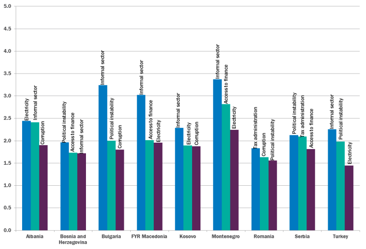In BEEPS V, the top three obstacles identified by firms in the transition region were (i) competitors’ practices in the informal sector, (ii) access to finance and (iii) electricity. In BEEPS IV, which was conducted in 2008-09, the same three obstacles made up the top three, with access to finance and competitors’ practices in the informal sector switching places. Chart 2 shows the top three obstacles in each country according to BEEPS V.