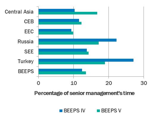 Furthermore, the percentage of senior managers’ time that is spent dealing with requirements imposed by government regulations – such as taxes, customs, labour regulations, licensing and registration (including dealing with officials and completing forms) – increased by an average of around one percentage point, rising from 12.4 per cent in BEEPS IV to 13.5 per cent in BEEPS V (see Chart 16). The largest increases were recorded in Central Asia, while Russian and Turkish firms reported significant decreases.