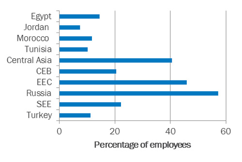 Chart 10 shows that the percentage of employees with a university degree in SEMED countries was below that in other EBRD regions, with the exception of Turkey.