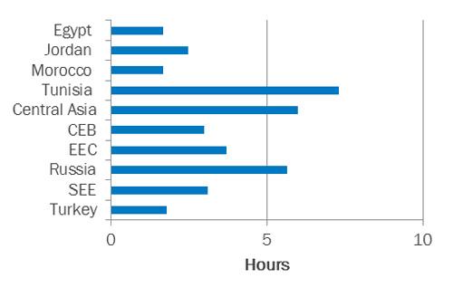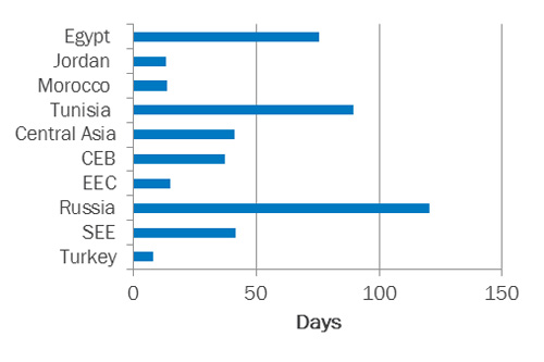 That being said, there exists huge variation across the SEMED countries. In Jordan and Morocco, firms were connected to the electricity grid within less than two weeks, while they had to wait more than 75 days in Egypt and almost 90 days in Tunisia (Chart 11) – the situation was worse only in Russia, where the firms had to wait 120 days. In both Egypt and Tunisia, the investment in the networks has been lagging behind due to lack of funding.