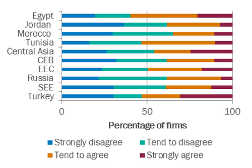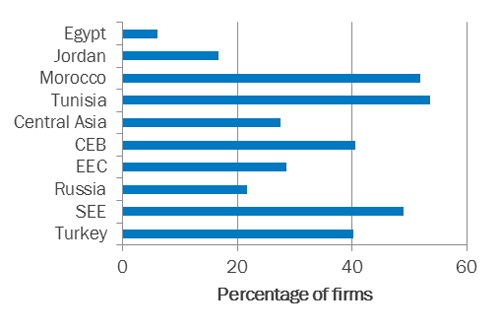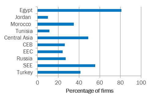 Interviews with the managers of more than 4,400 firms reveal that firms in the SEMED region face a difficult business environment. They regard political instability, corruption and competitors’ practices in the informal sector as the main business environment obstacles, but the business environment they are facing on average compares less than favourably to that of the rest of the EBRD region on other dimensions as well – in particular, access to finance, workforce skills and reliability of electricity supply. Moreover, SMEs in particular are more likely to be credit-constrained than their counterparts in the rest of the EBRD region.