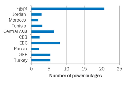 Although slightly fewer firms reported experiencing power outages in SEMED than in the rest of the EBRD region, they on average experienced more power outages in a typical month (7.2, compared with 5.2 in the rest of the EBRD region). Firms in Egypt had to deal with more than their fair share of power outages, with more than 80 per cent of them experiencing outages (among the highest in the EBRD region), compared with 35 per cent of firms in Morocco and 10-12 per cent in Jordan and Tunisia (Chart 12). Jordan had an energy crisis in 2012, but has since recovered.