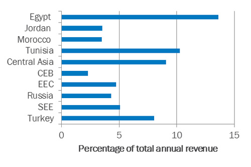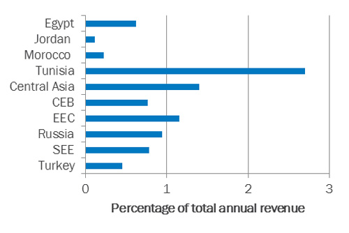Egypt also performed much worse than others in terms of the number of power outages in a typical month (Chart 13) – the situation was particularly bad in 2014, when most of the interviews in Egypt took place. While each of the power outages was on average shorter in duration than in other SEMED countries and EBRD regions (Chart 14), they resulted in higher losses – 13.6 per cent of total annual revenue, again among the highest in the EBRD countries. Losses resulting from power outages were also higher than in other EBRD regions in Tunisia – 10.3 per cent of total annual revenue (Chart 15).