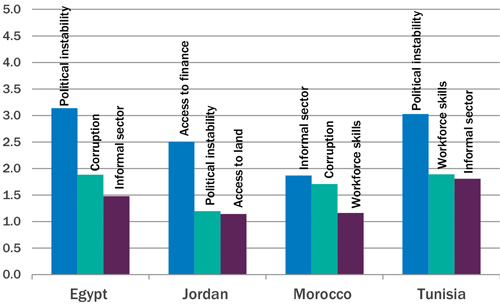 Large firms – those with at least 100 employees – were most concerned about corruption, political instability and limited access to finance. An inadequately educated workforce was among the top five obstacles for large firms in Jordan, Morocco and Tunisia.