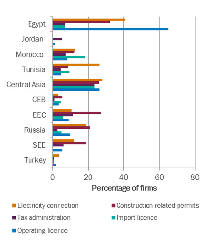 In Jordan, no firms reported that informal gifts or payments had been expected or requested in return for being connected to the electricity grid, while in Egypt, more than 40 per cent did. This was again higher than in any other EBRD region and second only to the Kyrgyz Republic, where half of all firms reported that informal gifts or payments had been expected or requested in return for being connected. In Egypt, more than 60 per cent of firms reported that an informal gift or payment was expected or requested in connection to an application for an operating licence, higher than in any other country in the EBRD region.