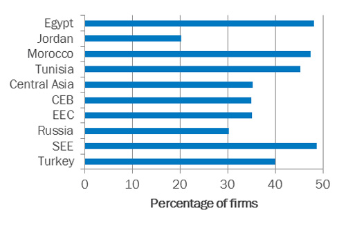 Competitors’ practices in the informal sector were the third most severe obstacle reported by firms in the SEMED region. Slightly more than 40 per cent of all firms mentioned that they faced competition from unregistered firms or other informal-sector activities, with that percentage ranging from 20.2 per cent in Jordan to over 45 per cent in the other three countries (see Chart 6). It was higher than the average in all other EBRD regions, with the exception of south-eastern Europe (SEE).