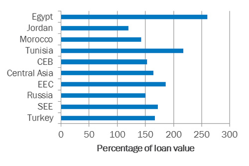 Chart 8 shows that the median collateral required for financing as a percentage of loan value was higher in SEMED than the rest of the EBRD region. It was particularly high in Egypt and Tunisia, where it was above the medians for the other EBRD regions and much higher for SMEs than for large firms. This has made it more difficult for SMEs in particular to access bank credit.