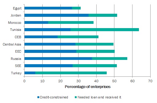 In SEMED, 46.2 per cent of firms reported that they needed a loan, ranging from less than a third in Egypt to almost two-thirds in Tunisia. This was comparable with the rest of the EBRD region, where almost half of the firms also reported that they needed a loan. However, the share of credit-constrained firms was considerably higher in SEMED: a total of 57.2 per cent of firms turned out to be credit-constrained compared with 51.3 per cent in the rest of the EBRD region. Taken together, this indicates that limited access to finance in SEMED countries was more of a supply-side phenomenon than in the rest of the EBRD region.